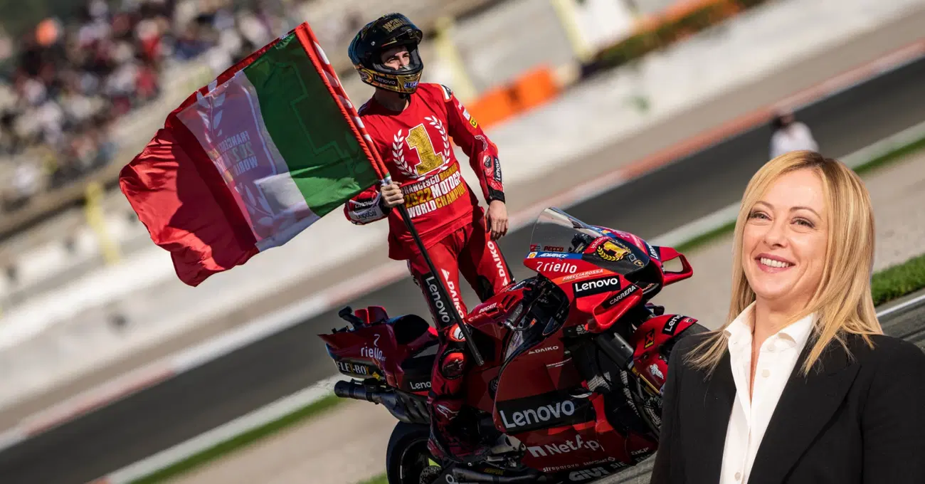 Pecco Bagnaia campione del mondo su Ducati. Un binomio italico che, tra le tanti prevedibili reazioni, ha suscitato anche quella del presidente del Consiglio Giorgia Meloni, che ha scritto: “Un giorno storico per il nostro sport. Francesco “Pecco” #Bagnaia e la #Ducati sono campioni del mondo della #MotoGP: un pilota italiano su una moto italiana! Orgoglio tricolore”.
