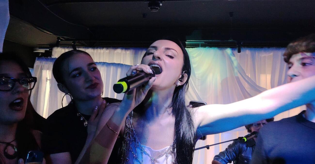 Così fan tutte, una dopo l’altra (e pure noi), mentre un’altra colossale fila di persone si allunga verso il bancone, foderata in pelle nera, e s’ingrossa mentre i camerieri in nero si aggirano agili tra la folla come dei pattinatori su ghiaccio, trasportando con maestria vassoi ricolmi di calici tintinnanti di prosecco. La gradazione alcolica ci mette ben poco a salire vertiginosamente tra gli ospiti, al ritmo delle due avvenenti Dj che nel mix ogni tanto “s’intruppano” tra una canzone e l’altra, ma non fa niente. Le perdoniamo. Sul palchetto vi sono cinque sedie vuote, quattro per i musicisti e una per la diva che tarda un poco ad arrivare. C’è tanta gente a gruppetti sedute sui divanetti, coppiette di fidanzatini che limonano duro ad ogni angolo della sala. L’amore è nell’aria, sarà la primavera. Verso le 11 i musicisti prendono a sedere e la folla inizia ad accalcarsi attorno al palco. I telefoni si sollevano insieme alle braccia dolenti di uomini e donne costretti a immortalare qualsiasi cosa che dia un senso alla loro vita. Le braccia-asta-videocamera si scontrano, bisticciano, poi però s’intrecciano, si uniscono, si strusciano. Sulle note dei violini anche il litigio alcolico per lo spot per il video migliore diventa un'ottima scusa per strusciarsi. Uomini contro donne, donne e donne, uomini e uomini. Le due violiniste, il violoncellista e il chitarrista intonano la melodia e attendono Arisa che ad un tratto prende a cantare Magica Favola, ma da dove? Tutti la cercano con lo sguardo sospeso nell’etere, nessuno la trova. Da dove arriva la sua voce? Finalmente emerge dalla folla come il Disinganno del Queirolo dalle sue stesse reti. Ha un vestitino bianco e una sottile rete di tessuto argentato che le avvolge il corpo e così sale sul palchetto davanti ad una folla dignitosamente brilla, ma necessariamente composta. Arisa sembra Biancaneve e il trasporto con cui canta davvero lascia che gli ebbri fra il pubblico regrediscano alla fase orale alla memoria delle fiabe narrate dalle proprie madri prima del sonno, e cullati dalla voce materna di Rosalba Pippa, prendono a cantare insieme a lei ormai devoti nei suoi confronti per il resto dei loro giorni.