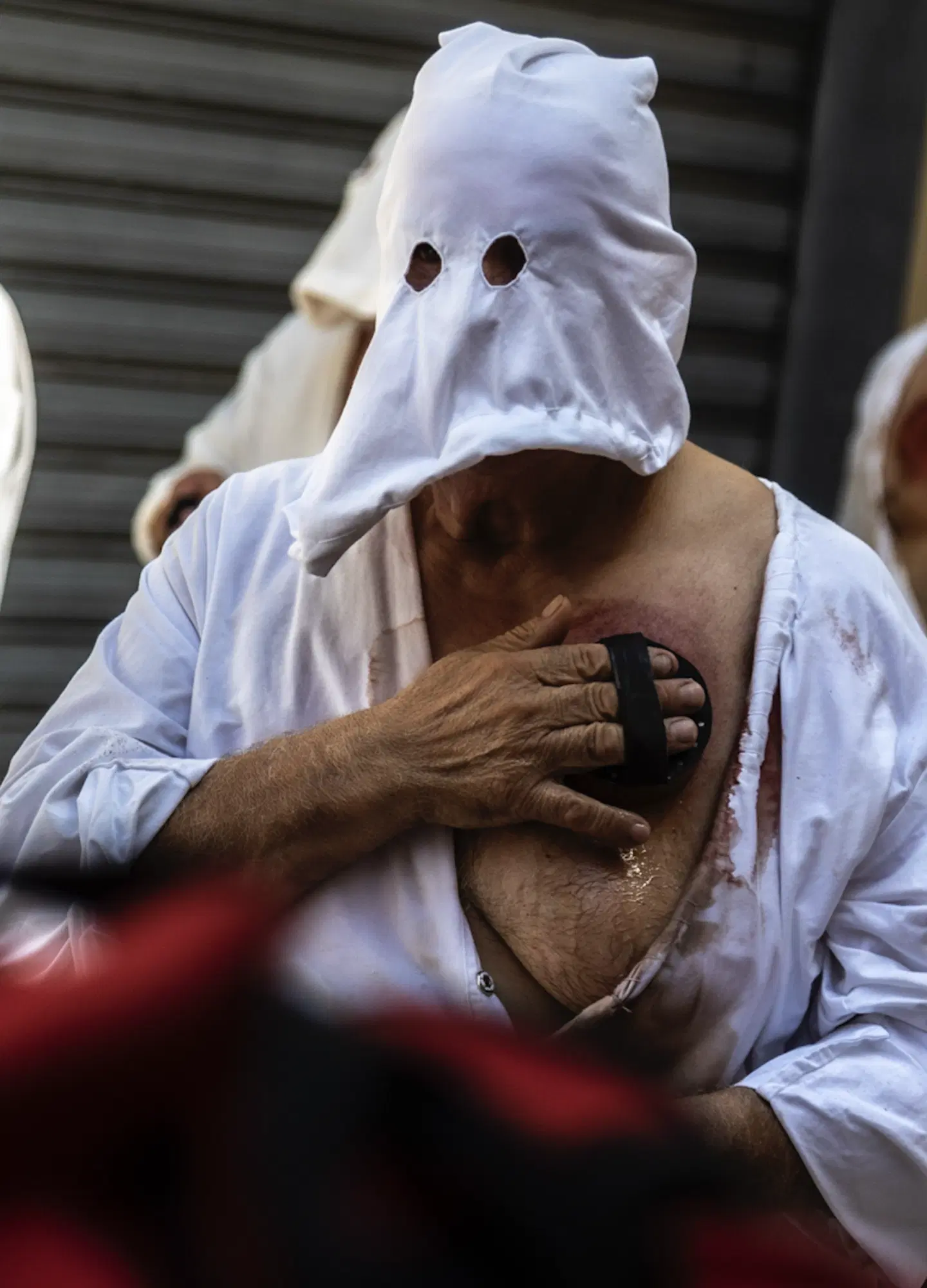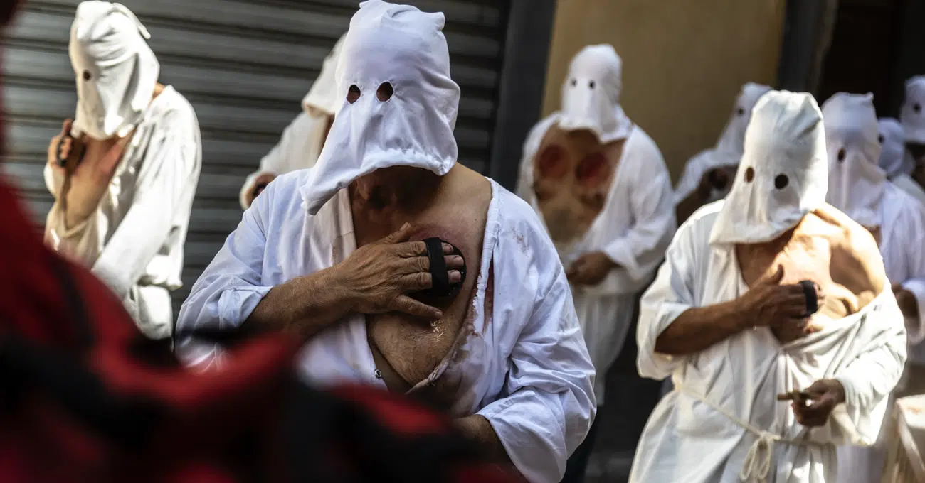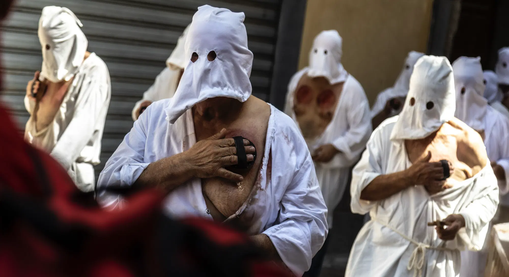 «Il nostro anonimato è legato al senso profondo che ha per noi l’atto di battersi per la nostra Vergine. Non sentiamo la necessità di far sapere la nostra identità, anzi facciamo di tutto per non farlo sapere perché si tratta, appunto, di qualcosa di molto intimo, personale, e relazionato al dolore che ognuno si porta dentro: un problema risolto o ancora da risolvere, o che mai si risolverà. Una malattia, o semplicemente l’amore che proviamo per la Vergine. E molto spesso accade che anche nella stessa famiglia si evita di dirlo, nonostante poi alla fine si intuisca. Ma - voglio dire -, per noi è un atto tanto profondo di amore che si evita, ad esempio, anche tra fratelli o tra padre e figlio di dire o chiedere chi seguirà la strada di un nonno, o di un genitore che si è battuto. Un altro elemento importante è che negli anni è aumentato anche il numero di donne che si battono». Il settantenne penitente, la cui identità resta ovviamente anonima, con gli occhi colmi di lacrime e la voce rotta dall’emozione descrive l’arrivo al giorno della processione generale, la notte prima, il momento dell’incontro con la statua della Vergine e quello della costruzione delle “spugne” che servono ai penitenti per percuotersi il petto a sangue. Sì, perché ogni sette anni vengono costruiti gli strumenti penitenziali. E anche in questo caso è un’attività che si tramanda in famiglia.