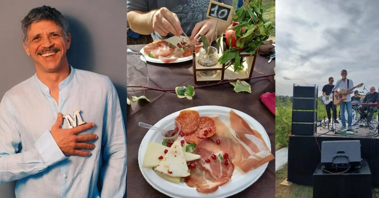 Cosa si fa di domenica con un sole tipicamente laziale, alle soglie di quella festa celtica che vorrebbe foglie morte e oscurità mentre noi mangiamo ancora cocomero e pane e frittata sui prati verdi? In barba a ragnatele e mocciosi che invece di bussare a stregate porticine salgono ascensori scalcinati romani e bussano a un Sor Armando qualunque, noi di MOW ce ne siamo andati a pranzo con Marco Morandi, in camporella. E precisamente a Vasanello, alla azienda agricola “Tenuta il Melograno”. Abbiamo vagato per campi secchi in provincia di Viterbo per circa un’ora di automobile, finito quasi un pieno di carburante fino ad arrivare in prossimità di filari di alberi di nocciole strepitosi a rotta di collo. Ci siamo persi tra altri ettari di piante di melograno e poco prima di tornare indietro stufi marci, abbiamo avvistato lunghe tavolate incastonate tra i filari con Marco Morandi in piedi su un palco intento a cantare. Ricordiamo che Marco Morandi, oltre a essere un attore, un cantante e un appassionato di olio, vini e natura, è il figlio di Gianni Morandi. Colui che da mezzo secolo guida l’Italia a cento all’ora per trovar la bimba sua, scongiurandola di scendere a prendere il latte. Ci siamo così abbarbicati nei pressi del banchetto, tendendo la pargoletta mano al verde melograno dai bei vermigli fior di carducciana memoria, preludendo all’atmosfera di ambientazione scolastica appunto, che di lì a poco ci avrebbe inghiottiti. Marco è friendly e tra una canzone e l’altra spiega aneddoti a un pubblico prelevato da un tuffo nel passato, totalmente digiuno, pare, di musica uscita dopo gli anni Settanta. “Non basta essere te, devi essere super”, chiosa al microfono Morandi junior. Si sente che avverte il peso delle aspettative della gente in generale e lo racconta nella sua canzone. Il tagliere di salumi induce delle riflessioni su questo tema esistenziale delle aspettative altrui. Il pubblico anche avverte la responsabilità di dover rendere di più a questa società vorace e giudicante e infatti trangugia le fette di salame con enorme dovizia.
