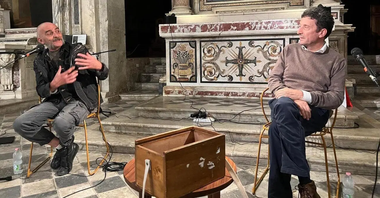 Pietrasanta. Ottobre anomalo, nel trapasso autunnale ancora il caldo si potrae nelle maniche corte dei passanti. Il bianco marmoreo della città fa parlare di città borghese, ricca, col tono della pulizia del sacro. È tutto un dire che in una bellissima Chiesa di Sant’Agostino (sconsacrata, o per meglio dire, secondo voci, sospesa dalle funzioni religiose) Giovanni Lindo Ferretti e Pietrangelo Buttafuoco danno vita all’ultima serata del giorno al Festival dell'editoria e del giornalismo “Libropolis”. È tutto un dire, perché tengono botta alla rottura del classico passivo della conferenza. Gremita la chiesa come a una messa di tempi che furono, non hanno niente da proporre, non un canovaccio già pronto da ripetere.