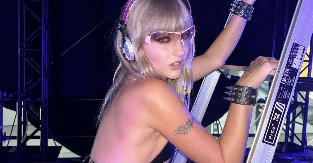 C’è anche molto di Madonna prima maniera in questi ultimi scatti, della indimenticabile material girl e del dibattito de “Le jene” di Quentin Tarantino se “like a virgin” volesse o no significare un rapporto di una ragazza con un tizio le cui dimensioni la facevano sentire come se fosse vergine. Così appaiono anche fibbioni da cowgirl su minigonne indossate da amiche accompagnate dalla scritte “heat is eating” insieme all’abusata emoji dello schizzo sudante o sq*irtante in cui non si capisce se è il caldo che sta mangiando vive le due o se è una scrittura refusica di heat and eat: pronto da mangiare, a portar via, cotto e mangiato diremmo noi, pronta da affondarci la faccia e i denti direbbe Billie Eilish. È tutta una citazione e un rimando alla cultura pop americana, quella messa in atto da Victoria in versione dj, un subliminalismo sessuoso che discende direttamente da Vance Packard e dai suoi “Persuasori Occulti” dove si spiegava che era il sesso il motore principale della comunicazione commerciale. Così questo vintagismo iperconsapevole scavalca il trash e persino il camp e finisce dritto nel cyberpunk, nei cowboy della consolle di William Gibson, nel suo Case, nel suo Count Zero, nella sua Molly con innesti cibernetici nel corpo flessuoso, e Victoria diventa un tutt’uno con il suo mixer dal quale non viene sparata fuori solo musica, ma sudore, s*uirt, brandelli di carne, grandi e piccole labbra, pezzi di seno, ma in forma di ologrammi di clip pop e i suoi famosi capezzoli stellinizzati o nastroadesivizzati alla Nina Hagem diventano essi stessi potenziometri, pirulini da girare ossessivamente alla maniera di quei dj che si portano la chiavetta da casa e per tutta la serata non fanno altro che spirulineggiare con i capezzoli, tanti, dei mixer come su vacche sacre da cui mungere frequenze.