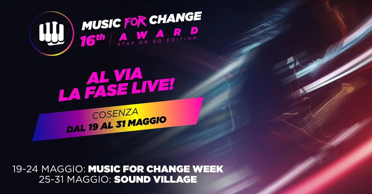 Non si tratterà solo di ascoltare buona musica, ma di vivere un vero spettacolo in cui il pubblico avrà un ruolo fondamentale: insieme a una giuria di esperti, dovrà decidere chi rimarrà nella competizione. “Stay or Go”: rimani o vai via! Ma non finisce qui! I 7 finalisti avranno l’opportunità di vivere un’esperienza unica al Sound Village (dal 25 al 31 maggio). Qui, tra il verde del Parco d'Arte Alt Art di Rende, i ragazzi lavoreranno a stretto contatto con produttori, autori e coach per scrivere, comporre e produrre i loro brani, che saranno presentati nella finale di ottobre. Quest’anno, i finalisti saranno chiamati a confrontarsi su 7 temi: Resistenze e Democrazia, Ambiente e Ecologia, Cittadinanza Digitale e Cyber-Risk, Parità di Genere e Diritti LGBTQ+, Lavoro e Dignità, Migrazione e Popoli, Disuguaglianze e Marginalità Sociale. Il 31 maggio, con la serata speciale "Words & Awards", verranno premiati tre artisti per il loro impegno nei diritti civili e nell'ambiente. Ma non sarà solo una premiazione: sarà una festa della musica, dell’impegno e delle buone pratiche, con performance live e tante emozioni. Ad esirbirsi quest'anno, in uno showcase a ingresso gratuito (con prenotazione obbligatoria), saranno: Federico Zampaglione (Tiromancino), Mezzosangue e Francamente. La finale di Music for Change si terrà poi il 10 ottobre al Teatro Rendano di Cosenza, quando i brani realizzati dai finalisti saranno presentati al pubblico e alla giuria, che decreterà i vincitori.