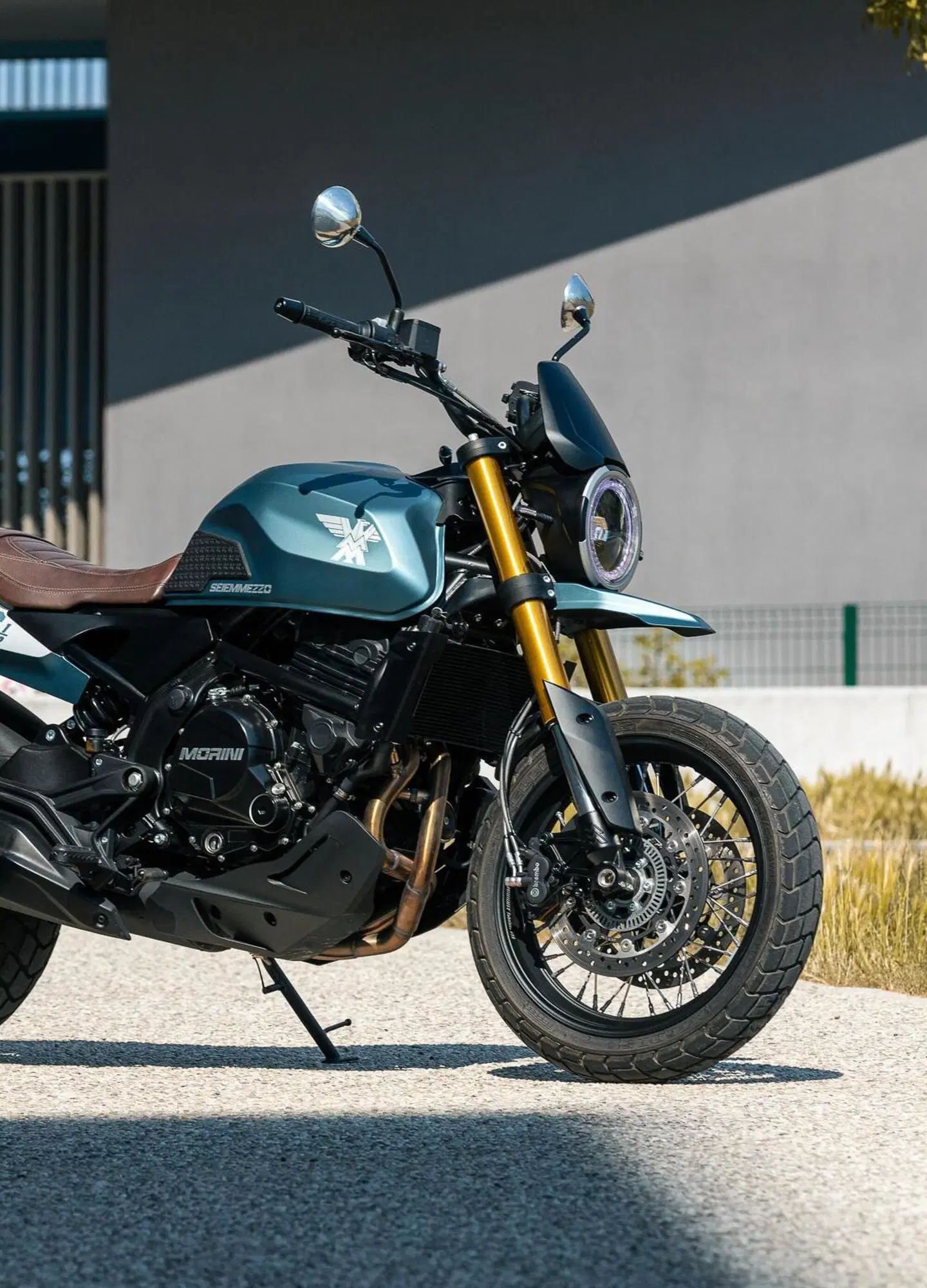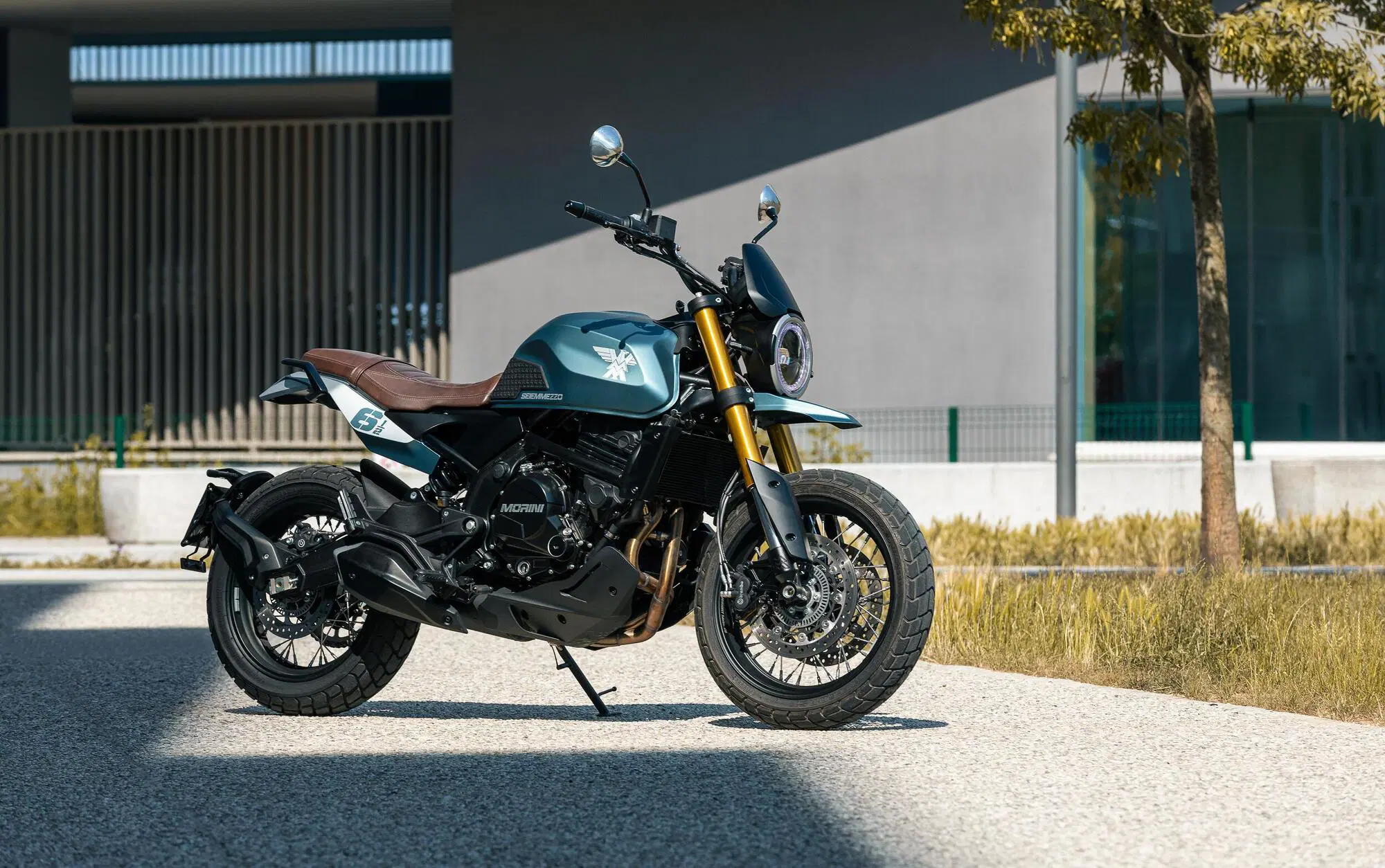 Ma la cosa che ti colpisce di più della SEIEMMEZZO, quando ce l’hai in mano, è il livello delle finiture. Perché, oh, Moto Morini la mette in vendita a partire da 6.990 €: esattamente come per X-Cape, un prezzo super competitivo. E quando ti ci avvicini, però, vedi che monta un bel TFT a colori da 5 pollici, che, tra l’altro, permette via bluetooth di gestire simultaneamente un telefono e due dispositivi auricolari. Poi guardi bene e vedi che la fanaleria è full LED, i comandi sono retroilluminati, le tubazioni sono in treccia, ti ricordi che il forcellone è in alluminio e ti accorgi che le pinze freno sono firmate Brembo. Il serbatoio da 16 litri? È in acciaio, di quelli che pure alcuni marchi premium non fanno più. Le gomme, ancora, sono marchiate Pirelli, su entrambi i modelli e, naturalmente, c’è l’ABS, firmato Bosch. Insomma, più in generale è una moto curata, realizzata da chi le moto le ama e ama farle.