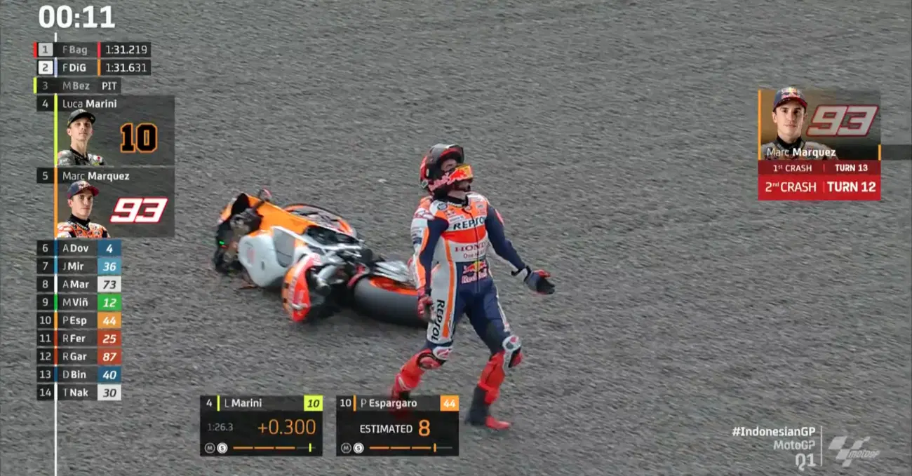 Marc ci ha provato due volte. La prima con tre decimi di ritardo al terzo settore, con la moto che lo scarica a terra nella più classica delle chiusure d’avantreno: lui comincia a correre per trovare recuperare la seconda moto mentre l’altra sta ancora rotolando nella ghiaia. Poi trova uno scooter, si fa portare al box e torna in pista per riprovarci. Si mette in scia a Nakagami - che lo rallenta fino a costringerlo al sorpasso - e poi scivola una seconda volta allo stesso modo, con la stessa violenza. In breve, Marc non ha ancora il giusto feeling con la moto ma è ancora lo scommettore di sempre. Nel dubbio ci prova.