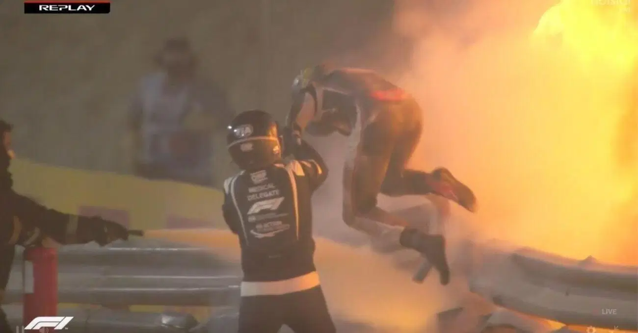 Immagini che ricorderemo per anni, quelle di questa mano che va a prendere e soccorrere un Grosjean visibilmente sotto choc, salvato da quell'istinto di sopravvivenza che lo ha fatto uscire in pochi secondi dalla monoposto e scavalcare il guardrail, addirittura senza una scarpa, persa proprio nel tentativo di salvarsi.