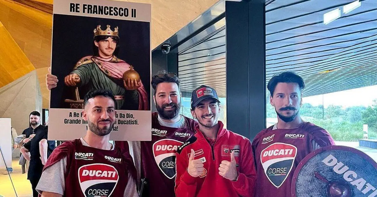 Per il 2023 i ragazzi hanno fatto un passo in avanti: dal giovedì del Gran Premio hanno cominciato a girare per il paddock vestiti da cavalieri, il cartello stavolta è dedicato a ‘Re Francesco II’ e sotto c’è scritto: “A Re Pecco, coronato da Dio, grande imperatore dei Ducatisti, vita e vittoria!”. Gente che con tutte le probabilità andrebbe d’accordo con gli amici di Valentino Rossi, quelli che hanno passato anni al bar a progettare e mettere in atto scenette comiche in caso di vittoria.