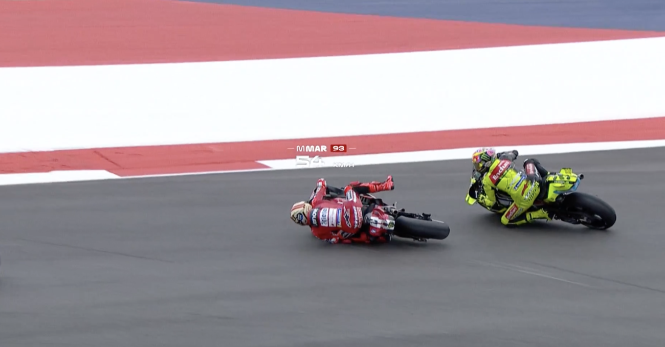 Quello che succede poco più tardi è la conferma del fatto che a Marc non piace farsi superare da un certo tipo di pilota, tendenzialmente quel tipo di pilota che lo affronta con durezza. Alcuni esempi: Pedro Acosta, Jorge Martín, Joan Mir. E, adesso, anche Fabio Di Giannantonio. Il fatto di aver subito il sorpasso da una Ducati in un circuito come il COTA deve avergli conferito punti extra. Sta di fatto che quando arrivano sorpassi come questo Marc tendenzialmente prova a restituirli subito. E così fa in curva 12, per il terzo posto. Solo che arriva troppo forte, troppo ottimista, perde l’anteriore alla corda e trascina con sé un Di Giannantonio che aveva anche allargato la traiettoria per lasciarlo sfilare, magari con l'idea di incrociarlo. Entrambi risalgono in moto, Marc arriva a fine gara con uno zero in classifica e qualche dato in più mentre Fabio è costretto a ritirarsi dopo un paio di giri, per altro dopo aver perso una parte piuttosto ampia della carena in mezzo alla pista.