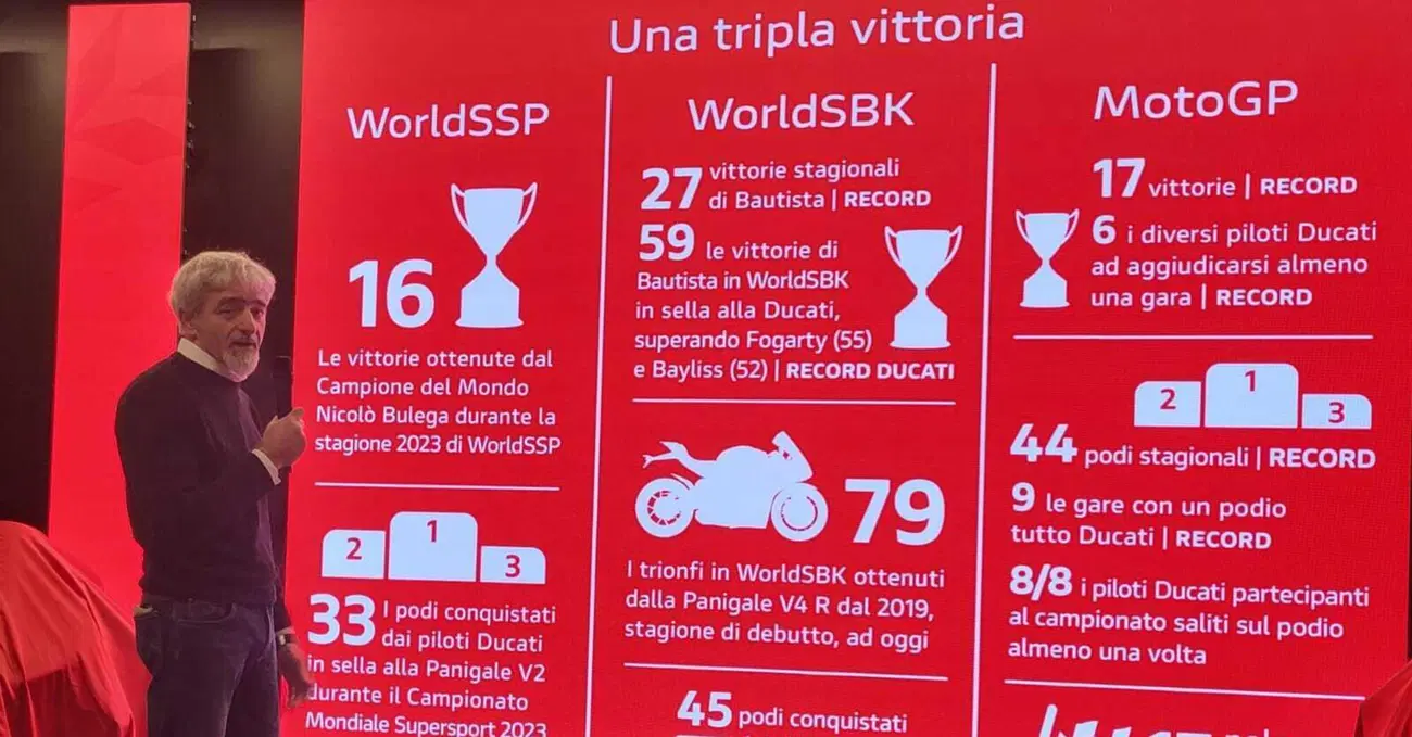 Alla grande festa di Ducati è stato quello che probabilmente s’è preso più applausi, nonostante tre campioni del mondo sul palco insieme a altri due fenomeni della MotoGP. Già questo basterebbe per provare a rendere la misura di chi è Gigi Dall’Igna. Uno che, però, non si emoziona anche quando è visibilmente emozionato e che la testa, come ha raccontato proprio a MOW nella giornata della grande festa all’Unipol Arena, la perde solo davanti ai numeri. Quelli fatti dalla Ducati quest’anno sono impressionanti, come racconta una slide proiettata sul muro proprio mentre stiamo per fargli la prima domanda.