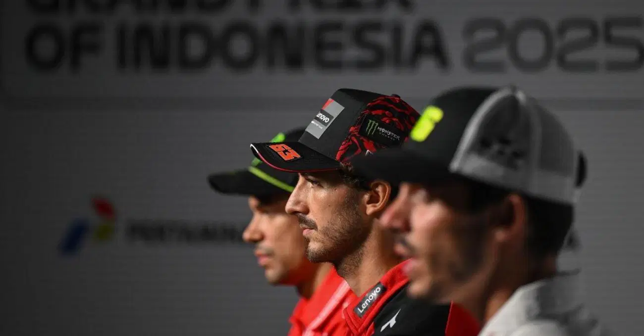Sull’accoglienza da parte dei tifosi indonesiani Bagnaia si lascia poi andare a una risata: “Mi sono sentito come Robert Plant nel più grande concerto dell’universo”. A questo punto, come di consueto, iniziano le domande della stampa. Bagnaia dice che adesso l’obiettivo è finire davanti ad Alex Marquez: “Il secondo posto adesso è il migliore a cui possiamo aspirare e farò di tutto per riuscirci”, poi racconta del fumo che usciva dalla sua moto (“Me lo hanno spiegato bene ma non ho capito, il motore però è a posto”) ma soprattutto racconta di quello che è stato fatto alla sua GP25, perché si dice che dal Giappone Bagnaia stia guidando la moto di Franco Morbidelli: “Il punto è che a Misano abbiamo deciso di provare cose diverse che anche in passato mi hanno dato più confidenza. Non confermo di aver provato la moto di Franco Morbidelli a Misano, confermo però che il feeling che ho ritrovato arriva da componenti che usavamo anche in passato”.