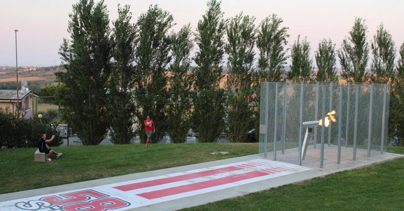 A Coriano sono le sei di pomeriggio e le persone, quasi tutte vestite di rosso e di bianco e con un 58 stampato da qualche parte, iniziano ad avvicinarsi ad un grande prato, sotto una terrazza panoramica. Lì, quasi nascosto fin quando non ci si affaccia, c’è il monumento che Dainese aveva donato alla cittadina del Sic per ricordare Marco Simoncelli, qualche anno dopo la sua scomparsa. “Dainese ha fatto realizzare questo monumento ormai parecchio tempo fa – racconta la sindaco, Domenica Spinelli – Noi, come Comune, abbiamo provveduto ad acquisire l’area per l’installazione e poi, dopo l’inaugurazione a cui parteciparono tanti personaggi del motociclismo, ogni domenica celebriamo il rito. Semplice, ma fortissimo, come era semplice e fortissimo Marco Simoncelli”. Alle 19, dal cannone che sembra voler evocare il tubo di scarico di una moto, si accende una fiamma che, più che generare calore, “si lascia circondare dal calore” di chi, dopo tanti anni, non dimentica quel ragazzo, quel pilota coi capelli da matto, che se ne è dovuto andare troppo presto. “Resta accesa per 58 secondi, ogni domenica. Poi, in alcuni fine settimana come quello scorso del GP di San Marino e come il prossimo del GP dell’Emilia Romagna, la accendiamo anche il sabato, sempre alle 19. È il nostro modo per ricordare Marco, facendo comunità con quelli di qui che lo conoscevano e gli hanno voluto bene e con quelli che, invece, gli hanno voluto bene pur non avendolo visto crescere se non grazie alle sue imprese sportive”.