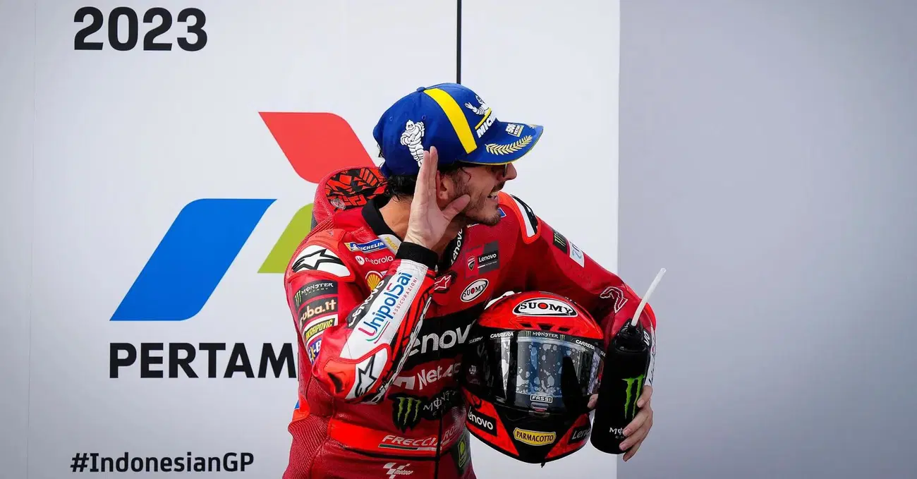 Pecco Bagnaia guarda la telecamera montata sul dashboard e muove la mano alla Luca Toni in esultanza da gol, che per chi passa le proprie giornate nel paddock è un movimento alla Paolo Simoncelli. La mano fa girare le rotelle in testa e il babbo del Sic dice “Andettend?”, un gesto che negli anni è diventato un adesivo che Valentino Rossi sceglie per celebrare sui social la vittoria.