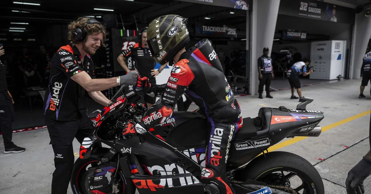La parte migliore arriva adesso. Prendi - la - moto. Fuori dal box ci sono dei nastri per terra, servono a indicare la posizione in cui mettere le RS-GP in caso di gara bagnata. Mi metto lì e aspetto che arrivi Maverick Vinales, pronto per prendere la moto al volo mentre lui scende e va a sedersi in poltrona. Victoria mi racconta che una giornalista straniera ha preso la moto per la manopola del gas rischiando un disastro e, quindi, di non imitarla. Sono lì, sotto il sole della Malesia, attorno alle 11:30 del mattino. I piloti cominciano a rientrare ma il nostro non si fa vedere. Passano due, tre, cinque minuti: niente. Cominciamo a pensare che si sia steso nel giro di rientro, il che probabilmente mi renderebbe assolutamente indesiderato nel box Aprilia, oltre ad azzerare la mia convinzione di essere stato utile. È così che si diventa superstiziosi. Ma no, eccolo che arriva, morbido, quasi rilassato, spegne la moto che ammutolisce a cento metri, la piega a venti metri e viene verso di me a una velocità esagerata. Io mi sento Keanu Reeves che ferma i proiettili, perché sto lì ad imporre le mani con una vocina che mi dice di fidarmi di questo scellerato abituato a viaggiare a 360 Km/h. Lui mi si ferma tra le mani e mi allunga un pugnetto. Io, in automatico, gli rispondo così, come fossimo nel Queens. La moto è leggerissima, il privilegio incalcolabile.