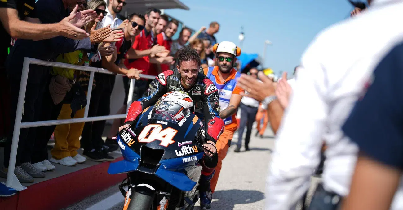 Personalmente ci ho messo un bel po’ a capire Andrea Dovizioso. Era l’altro lato di quel motociclismo che usciva dalla televisione con Valentino Rossi e Marco Simoncelli, il lato pulito e senza sorprese. Come un cantautore italiano a confronto con il rock britannico, meno riff e più parole. Dei cantautori te ne innamori quando cresci perché prima apprezzi solo il casino e l'eccesso, questa è la mia conclusione. Quando succede ti dici che ci sei arrivato tardi, che ti sei perso qualcosa, che l'eccesso, i cantautori bravi, sanno raccontarlo anche meglio. Al suo ultimo ingresso ai box ci sono gli amici con le bandiere, Razali che lo aspetta alla porta. 26 giri e poi l’ultimo. Un giro vissuto, come dice lui, in linea col personaggio: “Alla fine del T1 ho visto che stavo facendo il miglior tempo, quindi ho pensato a fare il giro veloce. Poi però volevo anche godermelo, così ho fatto un po’ uno e un po’ l’altro. E il tempo non è uscito”. Nel giro d’onore si ferma alla Curva del Carro, dove nel frattempo è stata organizzata un’invasione di pista degli amici più stretti. Tra gli altri, ci sono Lorenzo Baldassarri e Alex Gramigni. Andrea lascia la moto ai commissari, abbraccia un po’ tutti, si leva il casco. Poi si stacca le saponette, le firma, le lancia. Firma i guanti, lancia anche quelli. La gente urla il suo nome, lui si fa spingere per ripartire. A un commissario dice ridendo: “Ma che hai mangiato a pranzo?” perché stanno correndo troppo piano e la sua M1 non parte più, si è ritirata anche lei.