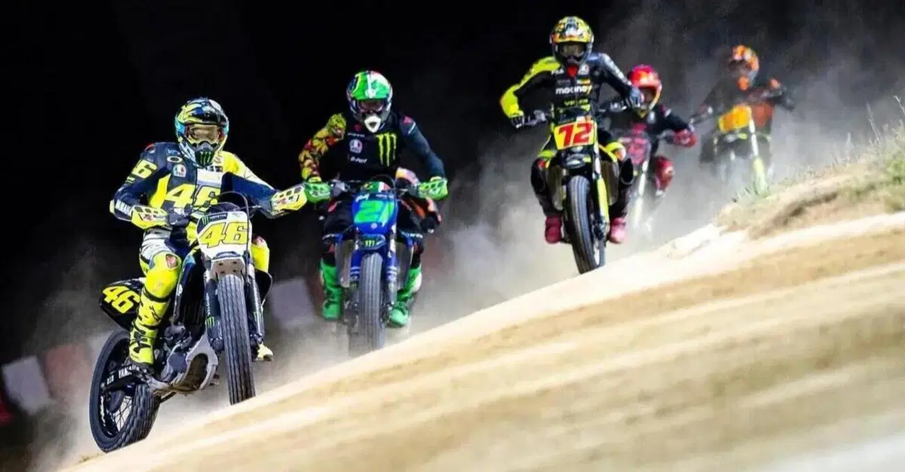 Il passaggio delle moto "scava" la terra del Ranch, dissolvendo il materiale speciale e trattato apposta per il flat track di casa Rossi (Albi Tebaldi, CEO della VR46, tiene gelosamente custoditi i segreti della sabbia magica). La traiettoria ideale, ora, non è più polverosa, bensì lucida: il fondo di cemento della pista emerge con il passare dei giri e al calar del sole diventa sempre più scivoloso. Imbarcate, chiusure di sterzo e traversi al limite diventano consuetudine. "Bisognerebbe passare coi trattori per metttere un pò di 'materiale' mentre i piloti girano" - scherza Albi. Ai margini della top 10 Jorge Martin si prende la scena esibendosi in una battaglia rusticana con Sammy Halbert, dopidichè Andrea Dovizioso (compagno del campione americano di fuoristrada) restituisce il servizio con una manovra chirurgica su Alex Rins. Il futuro pilota di Lucio Cecchinello, poi, è protagonista di un brutto volo - fortunatamente senza conseguenze fisiche - alla curva "Berta", copiato poco più tardi da Franco Morbidelli nella piega del "Lago". Il romano di Tavullia si rialza in fretta, ma condanna sé stesso ed Andrea Migno ad abbandonare le speranze di un podio.