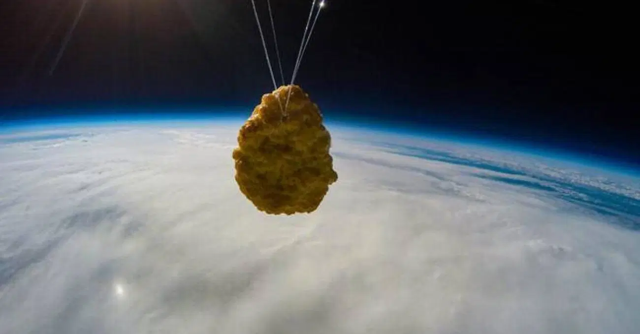 La pepita ha trascorso un'ora “fluttuando” nello spazio, a temperature che possono scendere fino a -65 gradi. Qui la pressione atmosferica è tale da obbligare un essere umano a indossare una tuta pressurizzata per sopravvivere. Ma una crocchetta di pollo può anche non indossare nulla.